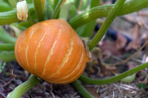 I was therefore excited to come home to some pumpkins of our own. I stashed seeds in corners throughout the gardens, and all have been growing well. The smaller “Small Sugar” variety have been the stars, flowering early under large healthy leaves.