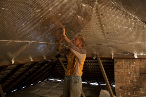 Thankfully I’ve got Wilhelm, our handy fix-everything-guy, to help me. So we’ve spent a number of afternoons up in the roof, nailing up the foil to the underside of the joists.