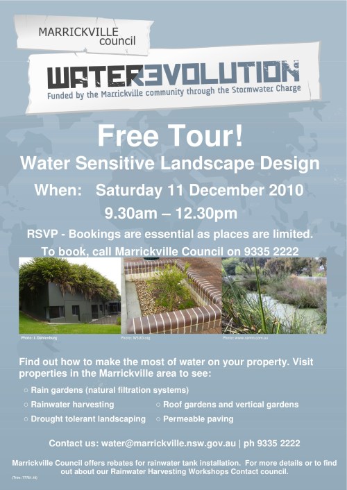 To book, download the poster, ring Marrickville Council on 9335 2222, or email water@marrickville.nsw.gov.au.