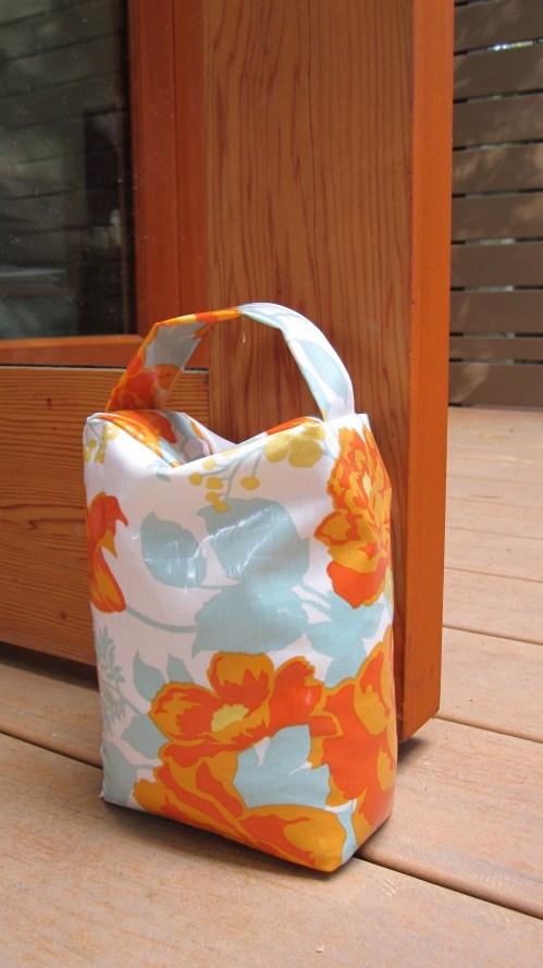 The fabric is a laminated cotton purchased from Oil Cloth Addict on Etsy. I hadn’t previously sewn with laminated cotton — I found it easiest to use when the laminated side was facing up on the sewing machine. The pattern suggests using corduroy but I thought laminated cotton was a better choice so the doorstop would be water resistant.