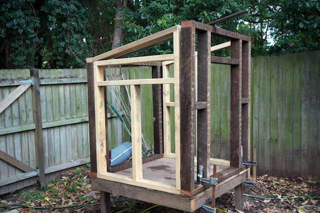 - The coop sits on a base frame of recycled hardwood, 500mm above ground level. This gives some protection against rats, termites and general rotting. It also gives the girls somewhere to shelter from the sun and rain, and they spend a lot of time napping under the coop.