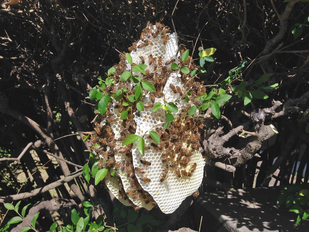 - Beaconsfield: a small wild hive — complete with comb — in a bush (see above). This was in the front of a good friend’s house and after trimming the bush, I was able to shake the bees into a box, then take the remaining comb.
