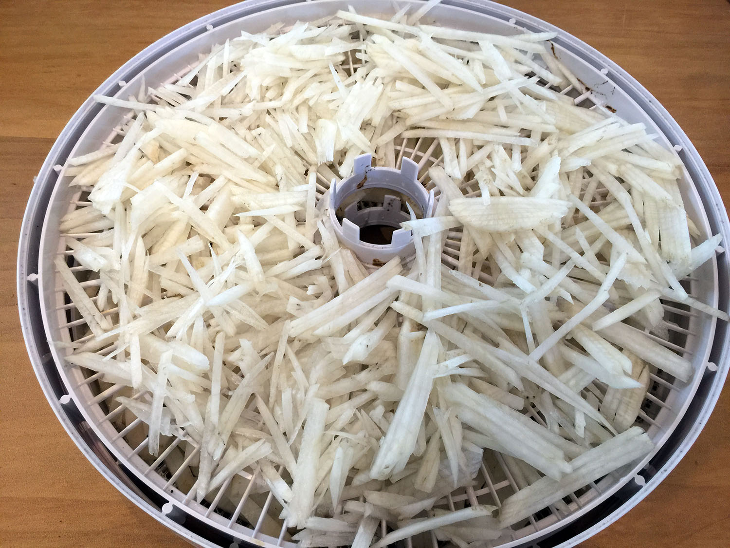 The process is a simple one: use a mandolin to cut the daikon into thin strips. I tried two different sizes of strips, and the daikon was processed in under five minutes.