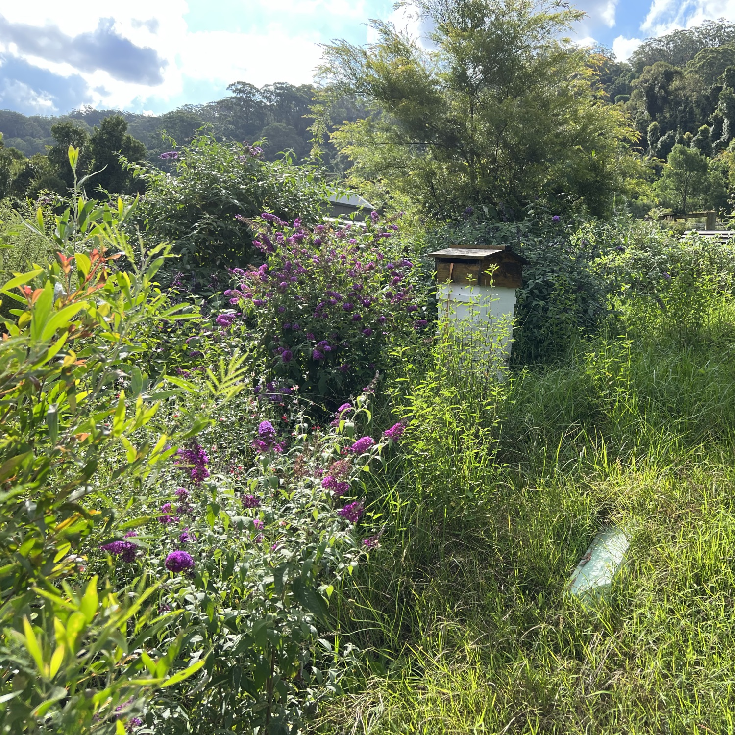 Following the permaculture principle of “start by improving the worst land”, the Bee Garden was established in an area that had been heavily damaged by the previous owner’s horses. Most of our hives are located in this garden, surrounded by an increasingly rich food forest of citrus trees and many flowering plants.