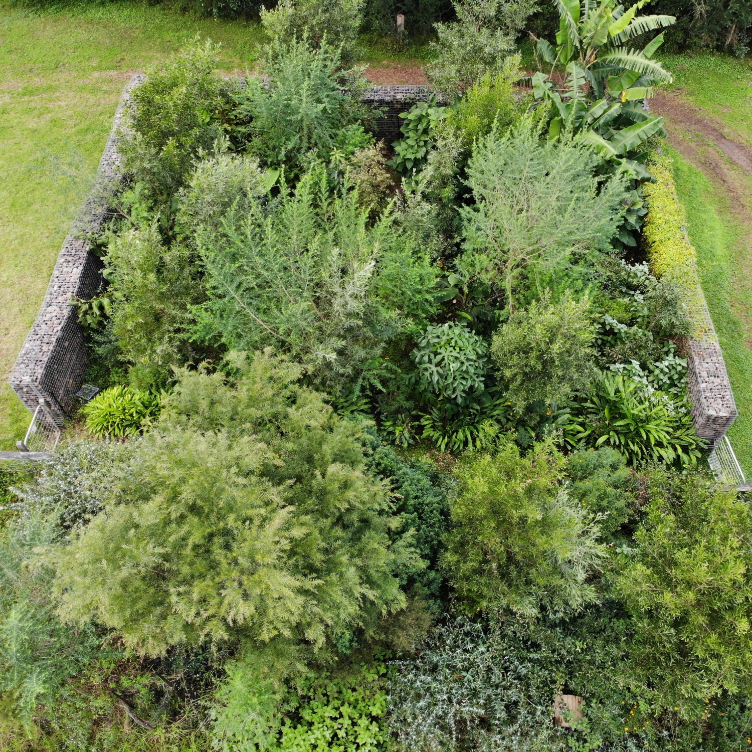 Loosely following “syntropic agroforestry” approaches, the dense initial vegetation builds up organic matter and soil biology as the climax trees are growing. Packing a lot in a small space, the walled garden includes many different species, including: Avocado, Mango, Banana, Black Sapote, Jaboticaba, Persimmon, Lychee and Tamarillo.